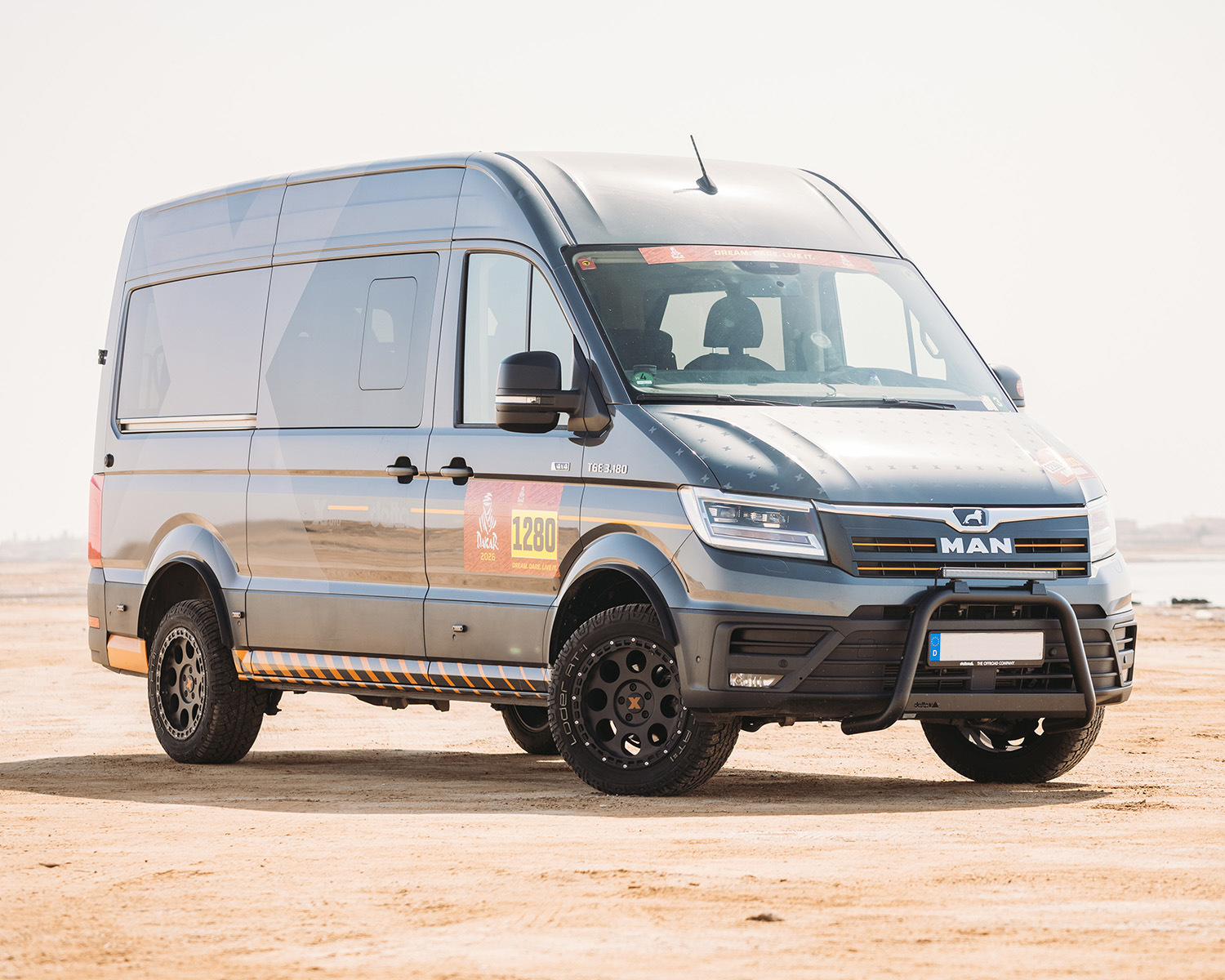 X-raid Teamchef Sven Quandt hat mit dem MAN TGE inklusive Cross-Country-Kit die komplette Serviceroute bei der Dakar 2026 absolviert – über 4.000 km quer durch Saudi-Arabien. Er fasst die Vorteile des neuen Setups zusammen: „Diese gezielten Modifikationen sorgen für eine deutliche Verbesserung der Fahreigenschaften. Auf tiefem Sand bieten die speziellen Loder Reifen einen verbesserten Grip und eine herausragende Traktion. Gleichzeitig profitiert der MAN TGE auch auf befestigten Straßen enorm von den größeren Felgen. Das unangenehme Walken der Reifen bei Kurvenfahrten wird reduziert, was die Fahrstabilität auf der Straße spürbar erhöht.“